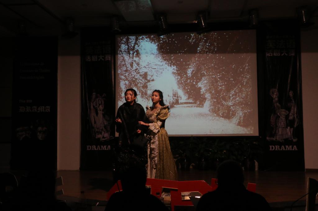 三位主持人幽默风趣的开场白瞬间带动起现场的气氛,比赛也正式开始。首先是艺术学院现代国际设计艺术分院的MIRACLE队为我们表演《The phantom of opera》,MIRACLE队每个演员的精彩表演仿佛让我们看见了经典话剧《歌剧魅影》的原画面。第二个上场的是艺术学院设计艺术分院童话队带来的《灰姑娘》,作为初赛的第一名,他们精湛的表演,赢得在场观众掌声连连。随后,外语学院双面人队、艺术学院传媒艺术分院 GLORY队、计算机科学与信息工程学院的计信学院代表队也同样带来了精彩的表演。环境与资源学院和管理学院代表队更是以两种不同的风格为大家诠释了《甄嬛传》中西文化结合的独特魅力。