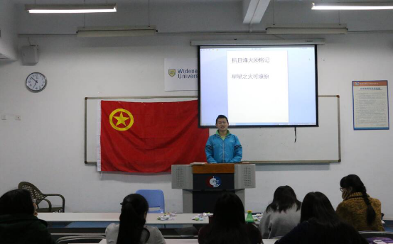 为积极响应院团委关于开展学习社会主义核心价值观的主题团日活动的号召,为培养和践行社会主义核心价值观,引领广大青年价值导向,提升同学们的思想道德修养,2015年11月2日下午18:00,15级金融一团支部全体成员于bsports必一407多功能厅开展了主题为“抗日烽火须铭记星星之火可以燎原”的团日活动。其中辅导员冯诗淇老师作为嘉宾出席了本次活动。