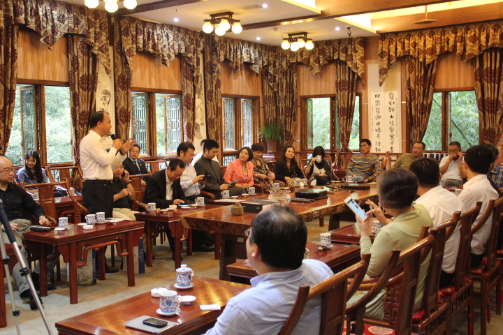 大会共四项议程,在赵经理热情洋溢的讲话和对各专家的介绍后,党总支副书记黄谦宣读了校外专家委员会章程(草案),该草案确立了委员会的基本框架,明确了委员会的职能、权责等事项。随后,潘和平教授为各位委员一一颁发了聘书并邀请多位委员讲话。最后大会顺利结束。在合影留念后,赵经理陪同各位专家一同前往了南山书院。在青山秀水间,在书香茶韵中,专家们深入交流了有关委员会的重点项目,合作方向等关键问题,为今后学院的建设发展献言献策。
